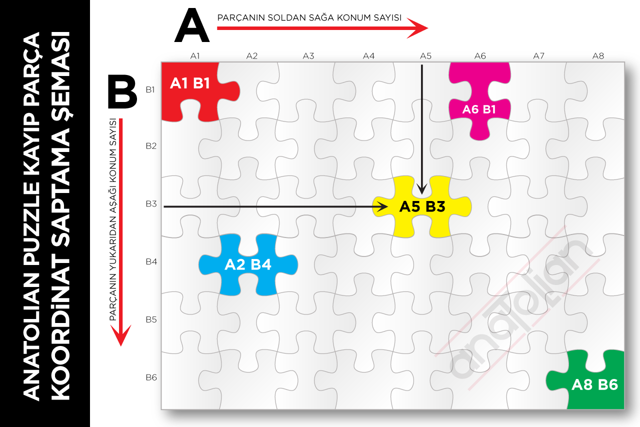 Anatolian Puzzle ürünlerinin kayıp parçaları tarafımızdan sağlanmakta ve kullanıcılarımıza ücretsiz olarak kargo ile gönderilmektedir. Farklı bıçaklarla kesilen aynı model tasarımlarda kayıp parça desteği verilmektedir... KAYIP PARÇA